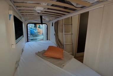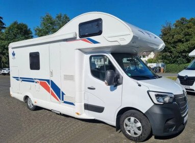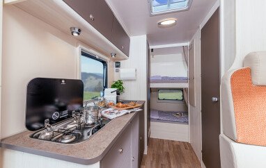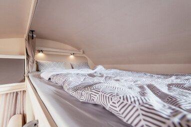 Ein Alkoven Wohnmobil bietet einen zusätzlichen Schlafplatz über dem Fahrerhaus und viel Stauraum. Ein Wohnmobil mit Alkoven ist ein Familienwohnmobil, denn es gibt dort Platz für bis zu sechs Personen. Aufgrund der Größe ist jedoch die Alltagstauglichkeit eingeschränkt, außerdem kann es durch den hohen Aufbau auch Einschränkungen bei engeren Durchfahrten geben. Im Reisealltag wird oft das Gesamtgewicht von 3,5 Tonnen überschritten. Das bedeutet auch hier benötigst du eventuell und je nach Reisemobil die Führerscheinklasse C1. Wohnmobilreisen mit einem Alkoven eignen sich für einen Familenurlaub auf großzugigen Stellplätzen.